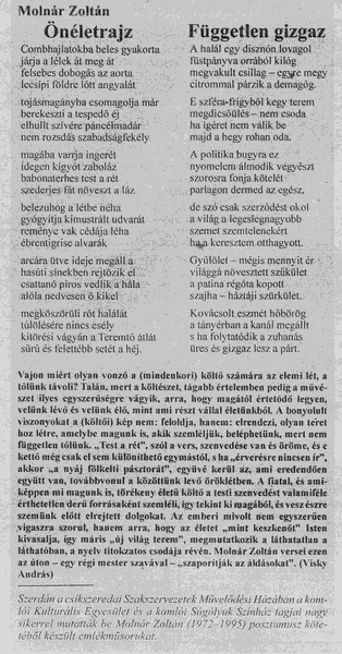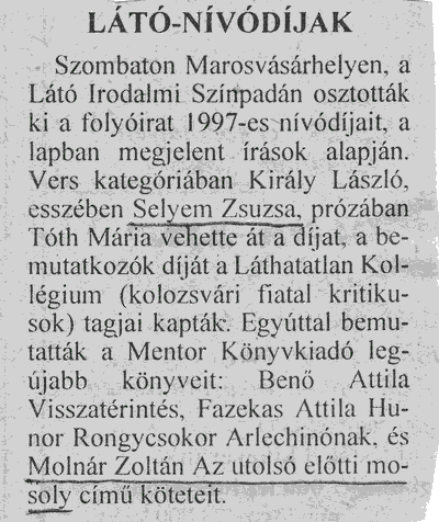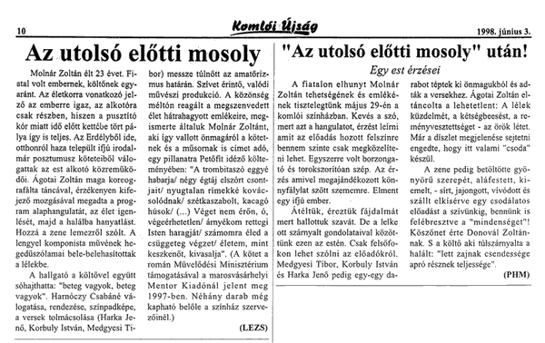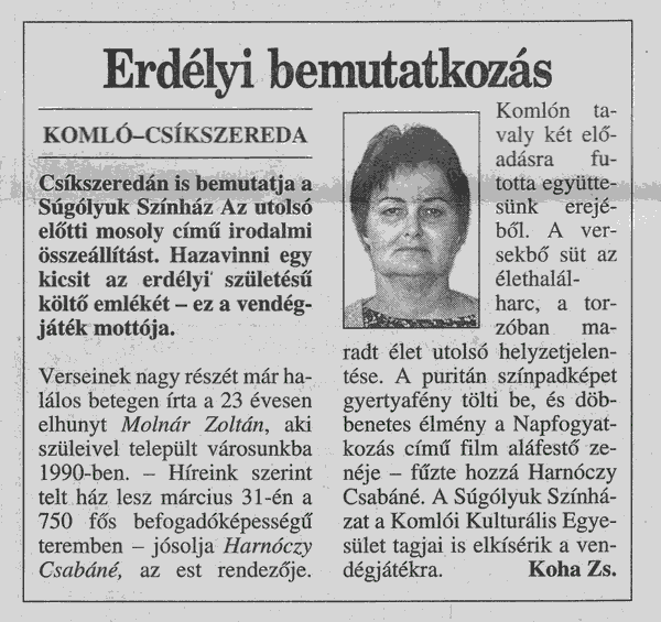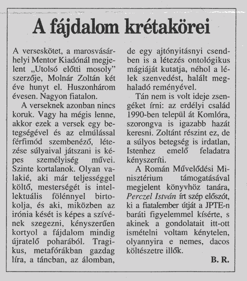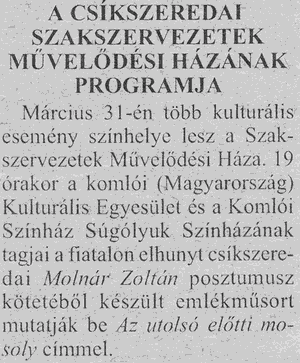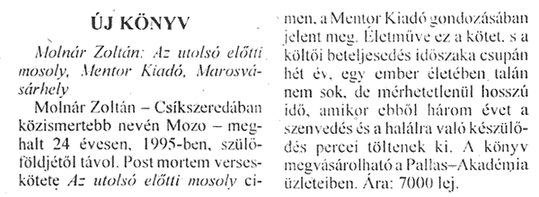 Hargita Népe KÖZÉLETI NAPILAP - Csíkszereda 1998.01.15: ÚJ KÖNYV - Molnár Zoltán: Az utolsó előtti mosoly, Mentor Kiadó, Marosvásárhely 1998.01.17: Molnár Zoltán: A tánc 1998.01.19: Molnár Zoltán: Az utolsó előtti mosoly c. kötet bemutatása a Látó Irodalmi Színpadán Marosvásárhelyen. 1999.03.24: Molnár Zoltán posztumusz kötetéből készült emlékműsor bemutatása a Csíkszeredai Szakszervezetek Művelődési Házában. 1999.04.02: Molnár Zoltán posztumusz kötetéből készült emlékműsorról. |