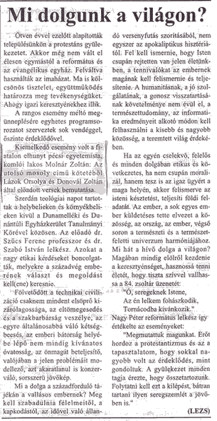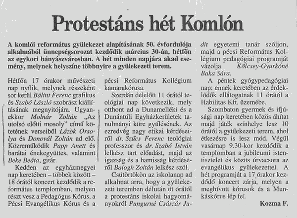 Dunántúli Napló KÖZÉLETI NAPILAP - Pécs 1998.02.28: Bóka Róbert: A fájdalom krétakörei 1999.03.18: Koha Zs.: Erdélyi bemutatkozás 1998.03.26: Kozma Ferenc: Protestáns hét Komlón |