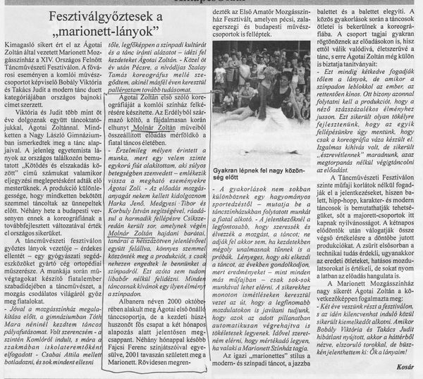 Komlói Újság KÖZÉLETI LAP - KOMLÓ 1998.06.03. Lerchné Zsuzsa (LEZS):Az utolsó előtti mosoly PHM: "Az utolsó előtti mosoly" után! Egy est érzései 1998.04.08. Lerchné Zsuzsa (LEZS): Mi dolgunk a világon? 2005.04.21. Kosár: Fesztiválgyőztesek a "marionett-lányok" - Ágotai Zoltán koreográfiájáról |