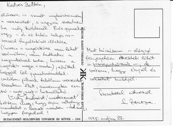 Az utolsó előtti mosoly Versek Megjelent: MENTOR KIADÓ, MAROSVÁSÁRHELY Kiadás éve: 1997 Szerkesztette: Selyem Zsuzsa A borítót Tordai S. Attila tervezte A kiadásért felel Káli Király István Nyomta a Lyra Kiadó Kft., Marosvásárhely Előszót írta: Perczel István Hátlap, fülszöveg: Visky András |