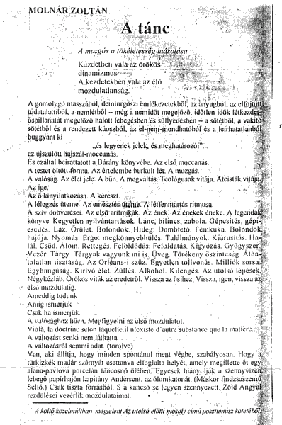 Hargita Népe KÖZÉLETI NAPILAP - Csíkszereda 1998.01.15: ÚJ KÖNYV - Molnár Zoltán: Az utolsó előtti mosoly, Mentor Kiadó, Marosvásárhely 1998.01.17: Molnár Zoltán: A tánc 1998.01.19: Molnár Zoltán: Az utolsó előtti mosoly c. kötet bemutatása a Látó Irodalmi Színpadán Marosvásárhelyen. 1999.03.24: Molnár Zoltán posztumusz kötetéből készült emlékműsor bemutatása a Csíkszeredai Szakszervezetek Művelődési Házában. 1999.04.02: Molnár Zoltán posztumusz kötetéből készült emlékműsorról. |